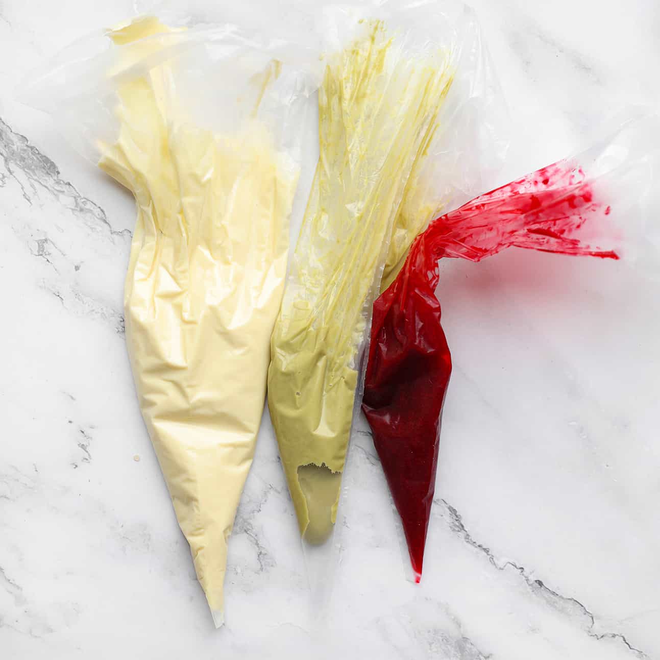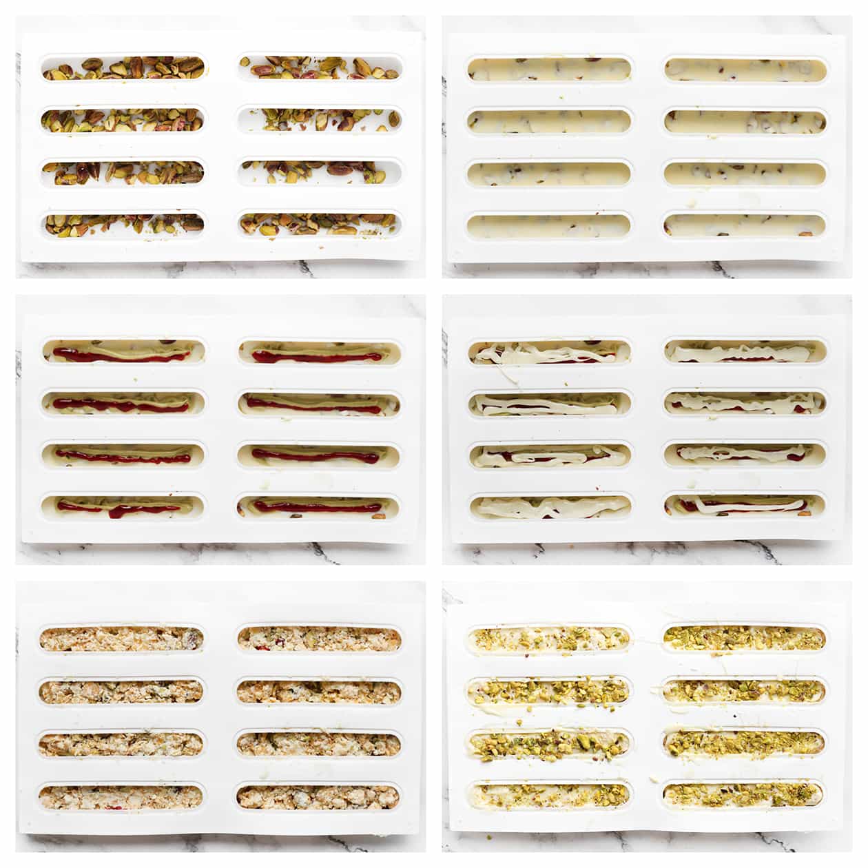 Take a silicone mold. Spread a layer of chopped pistachios over the bottom and cover it with a layer of melted white chocolate. Then, pipe a line of pistachio paste, raspberry jam, and white chocolate over it. Spoon some of the cornflake mixture on top and cover it with another layer of white chocolate. Sprinkle some chopped pistachios on top. Place the silicone mold in the freezer for 60 minutes, or until the chocolate has completely hardened. |