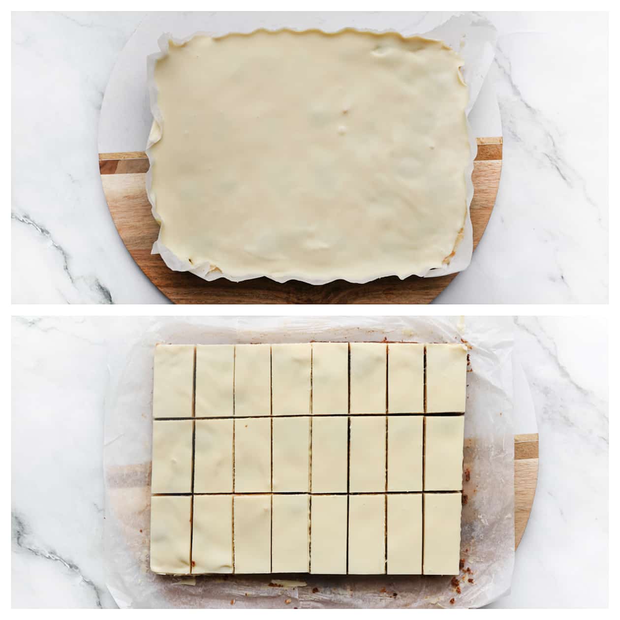 Gebruik een scherp, warm mes en snijd de koek in stukken.