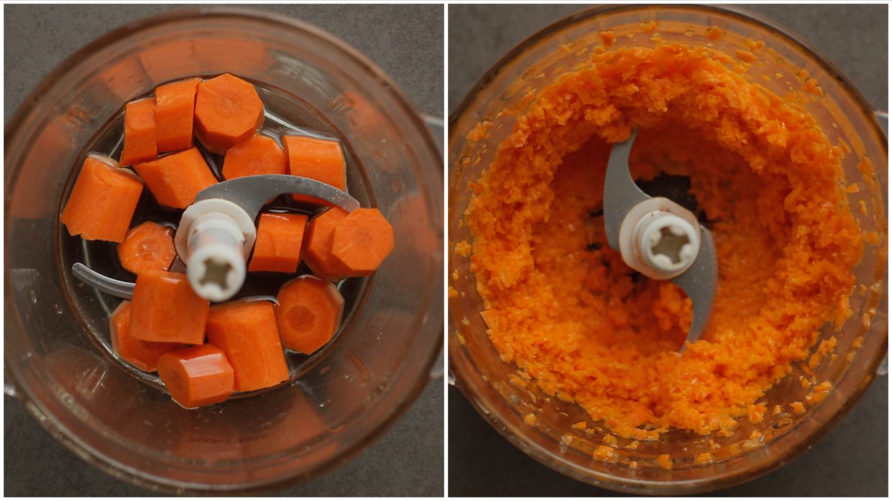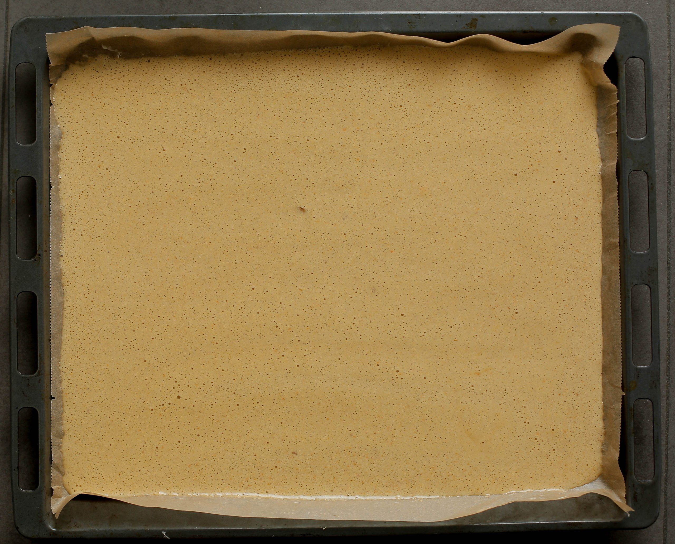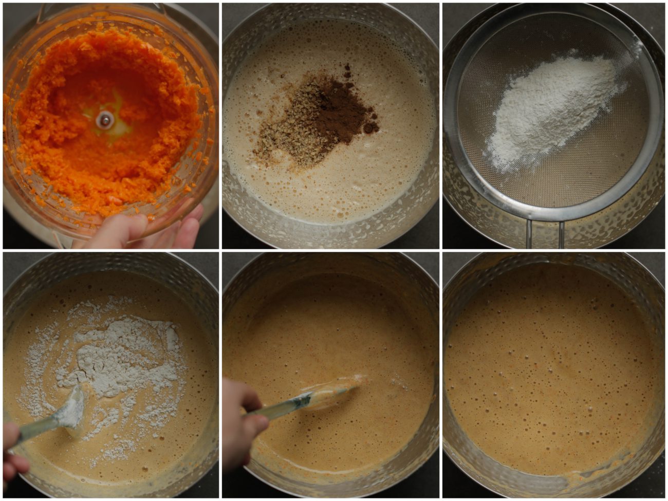 Voeg het wortelmengsel, de gemalen walnoten en kaneel toe. Mix een minuut. Zeef het bloemmengsel nogmaals boven een kom, alleen dit keer bovenop het beslag. Neem een spatel. Roer niet, maar spatel de bloem door het beslag (8 beweging). Dit zorgt ervoor dat de structuur van de rolcake luchtig wordt. |