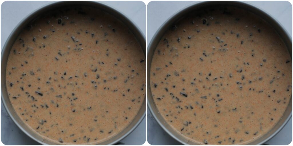 Breek de eieren boven een diepe kom. Voeg de suiker, basterdsuiker, vanillesuiker en zout toe. Mix voor een minuut. Voeg de zonnebloemolie, het wortelmengsel, de kaneel en walnoten toe. Mix goed. Zeef de bloem en bakpoeder boven de kom. Mix alle ingrediënten samen tot een gladde massa. Voeg als laatst de oreo kruimels toe en spatel goed. |