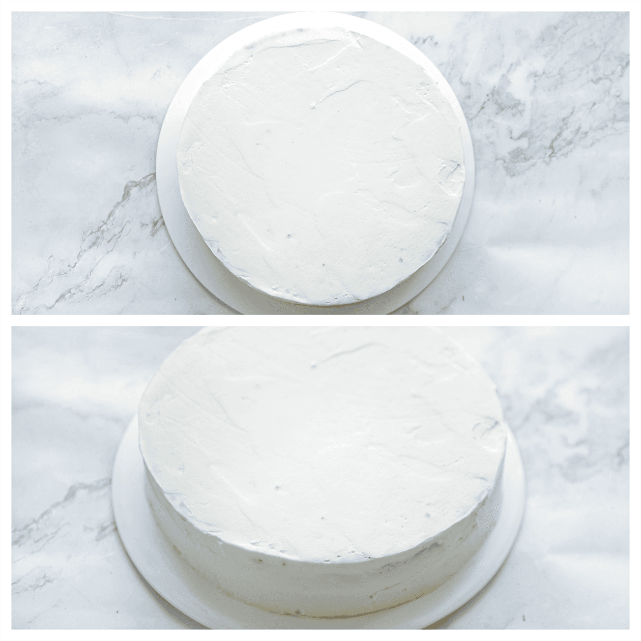Leg een vel bakpapier over de bodem van de bakvorm. Voeg de helft van het cakemengsel toe. Druk goed aan. Leg er huishoudfolie op en haal de cakelaag uit de bakvorm. Leg er weer een vel bakpapier neer op dezelfde bakvorm. Voeg de overige helft van het cakemengsel toe. Druk stevig aan. Schep de helft van de room erop en smeer goed uit. Bedek de room met de cakelaag. Druk deze goed tegen de randen aan. Spuit/schep de room erover. |