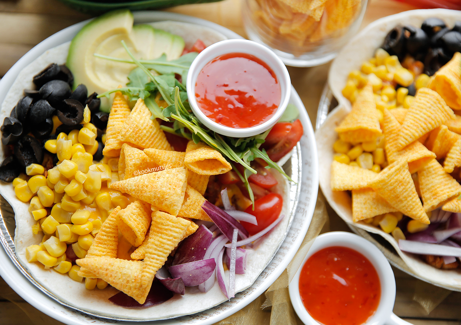 Maak het af met snoeptomaatjes, rode ui, avocado, mais, zwarte olijven en bugles.