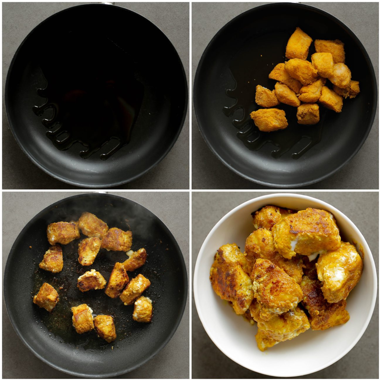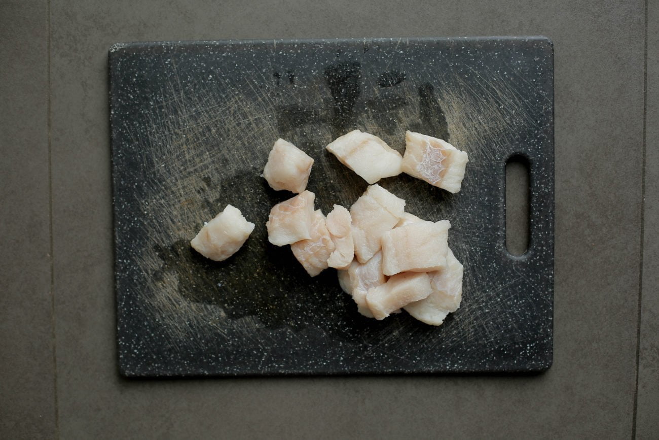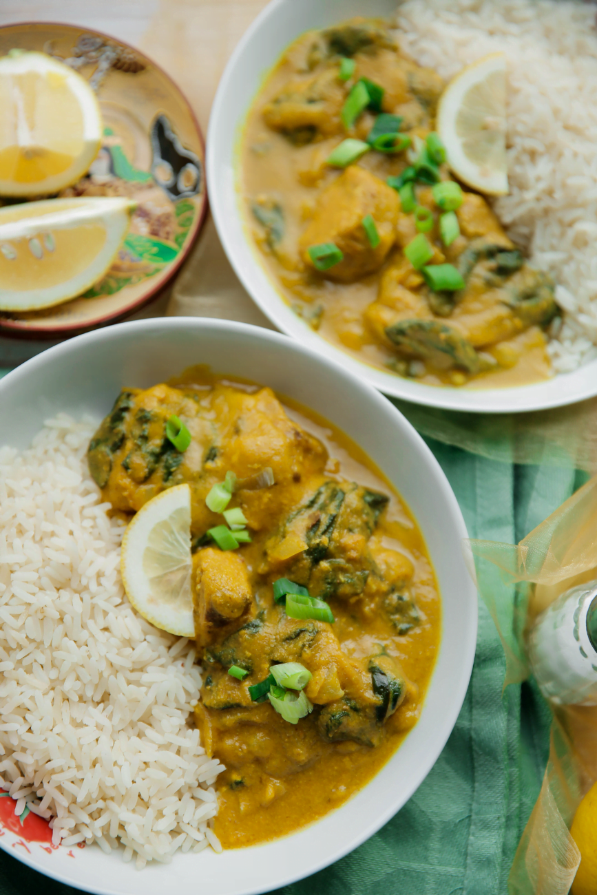 Verhit de olijfolie (25 ml) in een koekenpan op middelhoog vuur. Voeg de gele ui toe en bak 3-4 minuten. Voeg de spinazie toe en bak tot deze geslonken is. Voeg het pompoenmengsel, de currypoeder, het zout en water toe. Meng goed. Voeg de kabeljauw toe en zet het vuur hoog. Als het goed kookt, zet je het vuur laag. Kook, afgedekt, 15-20 minuten. |